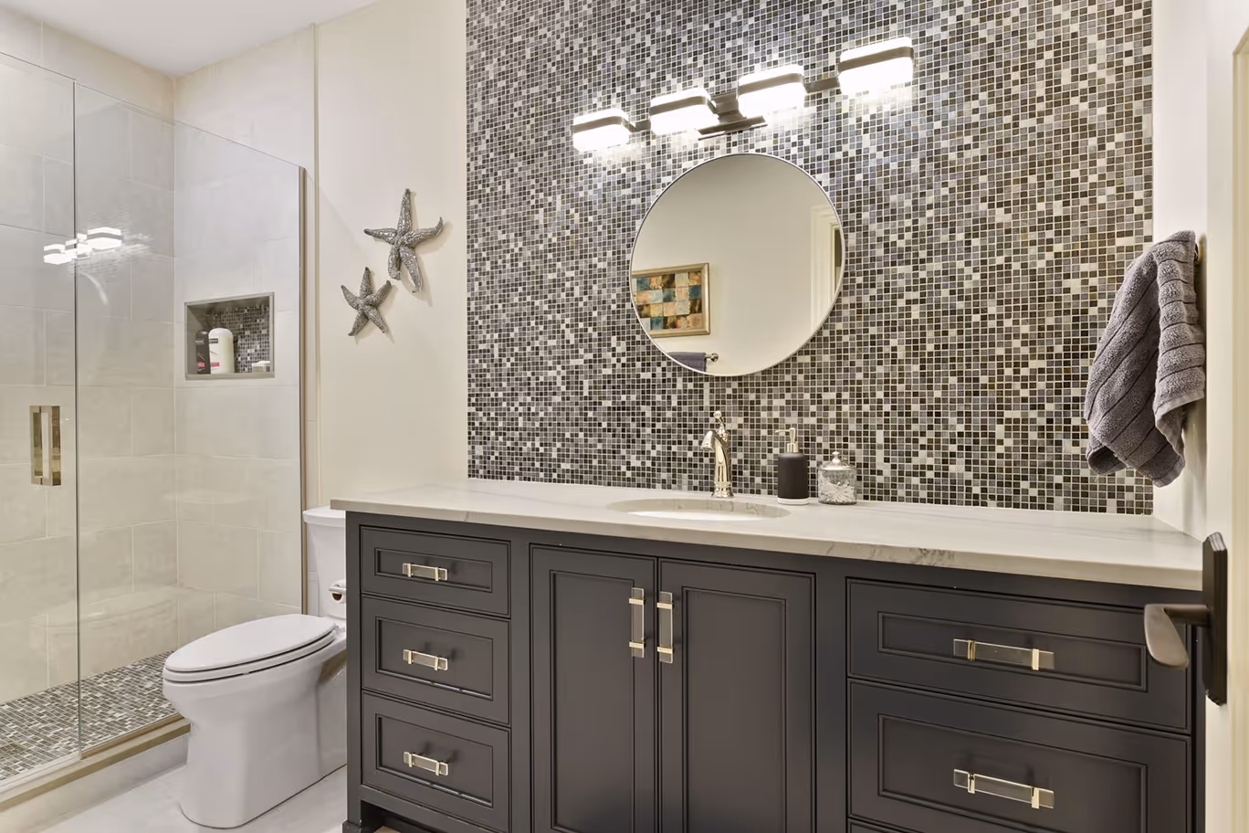 When done well, quality tile in the shower, on the walls, or flooring will look incredible. Other statement-making elements include your fixture choices: the tub, vanities, faucets, etc. Each part will be mapped out in your design and then chosen by you during the selection process.